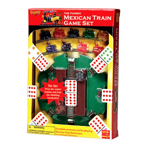 The Fundex Mexican Train Game Set is the perfect accessory set for hours of train-building fun. This innovative set comes with everything you need to transform any set of double twelve dominoes into the popular Mexican Train Game. Build your train out from the train station hub, and be the first to play all your dominoes. Play a domino on the Mexican train and you get to press the center domino to hear the "Woo-Woo" locomotive. Game set includes a unique 3D electronic train hub, nine train engine markers and instructions. Requires 3 "button cell" batteries (included). Dominoes sold separately. For 2 to 8 players. Read more...